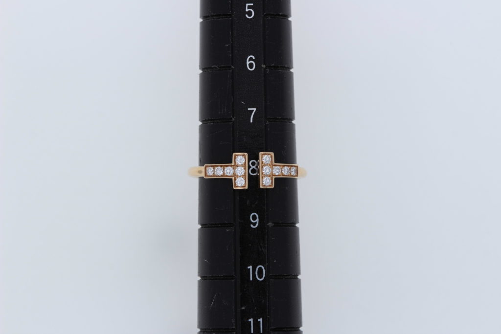 このティファニー T ダイヤモンド ワイヤーリングは、そのまん丸に近いアーム部分と中央が離れたデザインが特徴です。このため、サイズを大きくする際には、デザインの美しさを損なわないよう、ずれないように慎重に加工を進める必要があります。